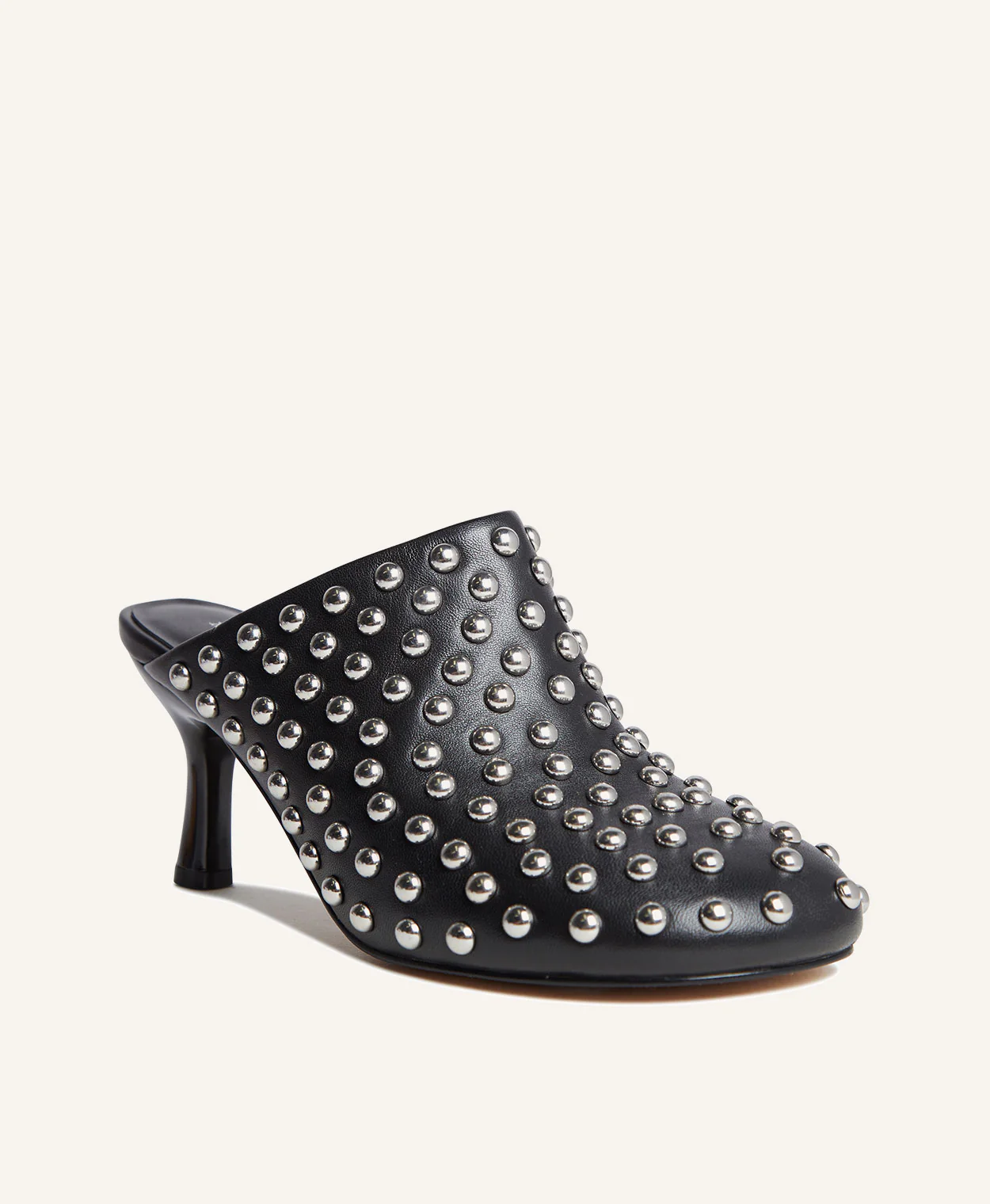 Turn heads with Ceecee, a daring leather mule designed with a rounded toe and a sleek mid-height heel. Embellished with bold metallic studs, this statement piece adds instant edge to any outfitâperfect for those who love to stand out.